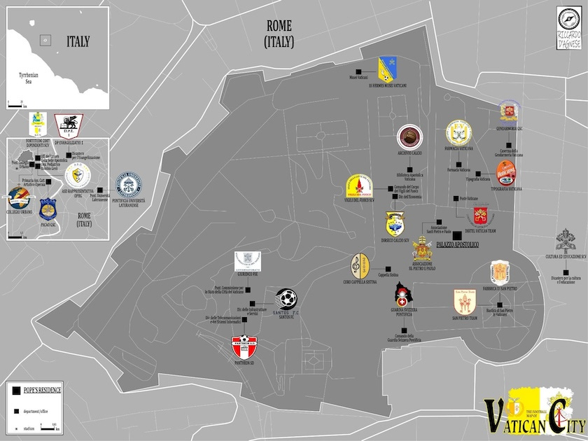 E torniamo alla grande con questa mappa delle squadre di calcio del Vaticano, composte da dipendenti e membri di Guardie Svizzere, Gendarmeria, Vigili del Fuoco, Musei Vaticani Calcio, Tipografia Vaticana, ecc. Qui si vede grande.