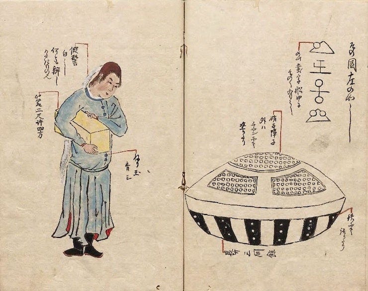 All’inizio del 1803 una stranissima imbarcazione si spiaggiò sulle coste del Giappone. La chiamarono utsuro-bune (nave vuota, cava), al suo interno c’era una bellissima ragazza. Spionaggio? UFO? Gente che ha bevuto troppo e si è inventato tutto? Non saprei ma le illustrazioni sono ottime.