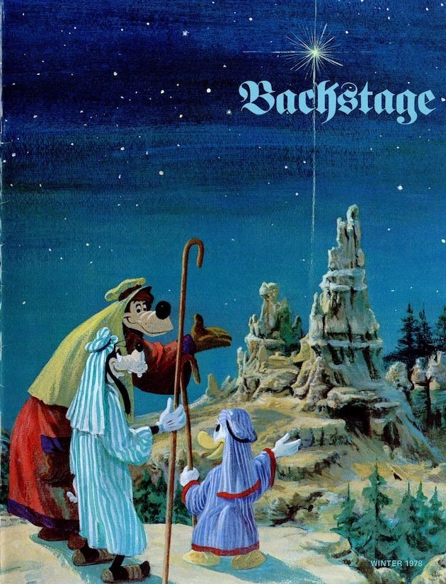 Una delle molte copertine pazzesche di Backstage Disneyland, giornaletto dedicato al parco dei divertimenti americano, originariamente rivolto ai suoi dipendenti. Se clicci qui trovi la sua storia e i suoi numeri scannerizzati.