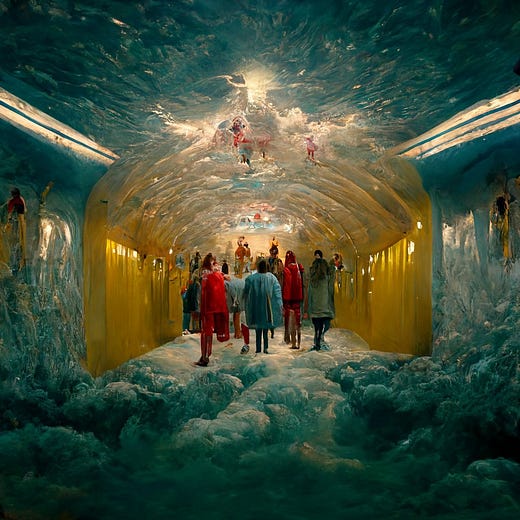 Un collega di Supercomposite ha anche pensato di unire un’immagine di Loab con una raffigurante un «tunnel di vetro circondato da angeli […] nello stile di Wes Anderson”. Ecco le due immagini: